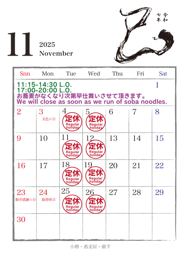 We will close once we run out of soba noodles for both lunch and dinner. While the last order times are listed, they may close earlier depending on the restaurant’s capacity.