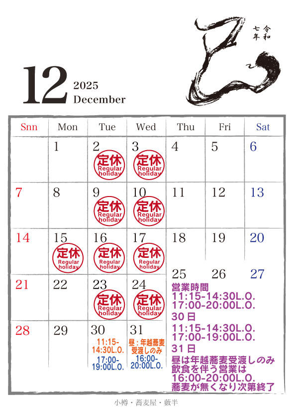 Lunchtime hours are for New Year’s Eve soba pick-up only.